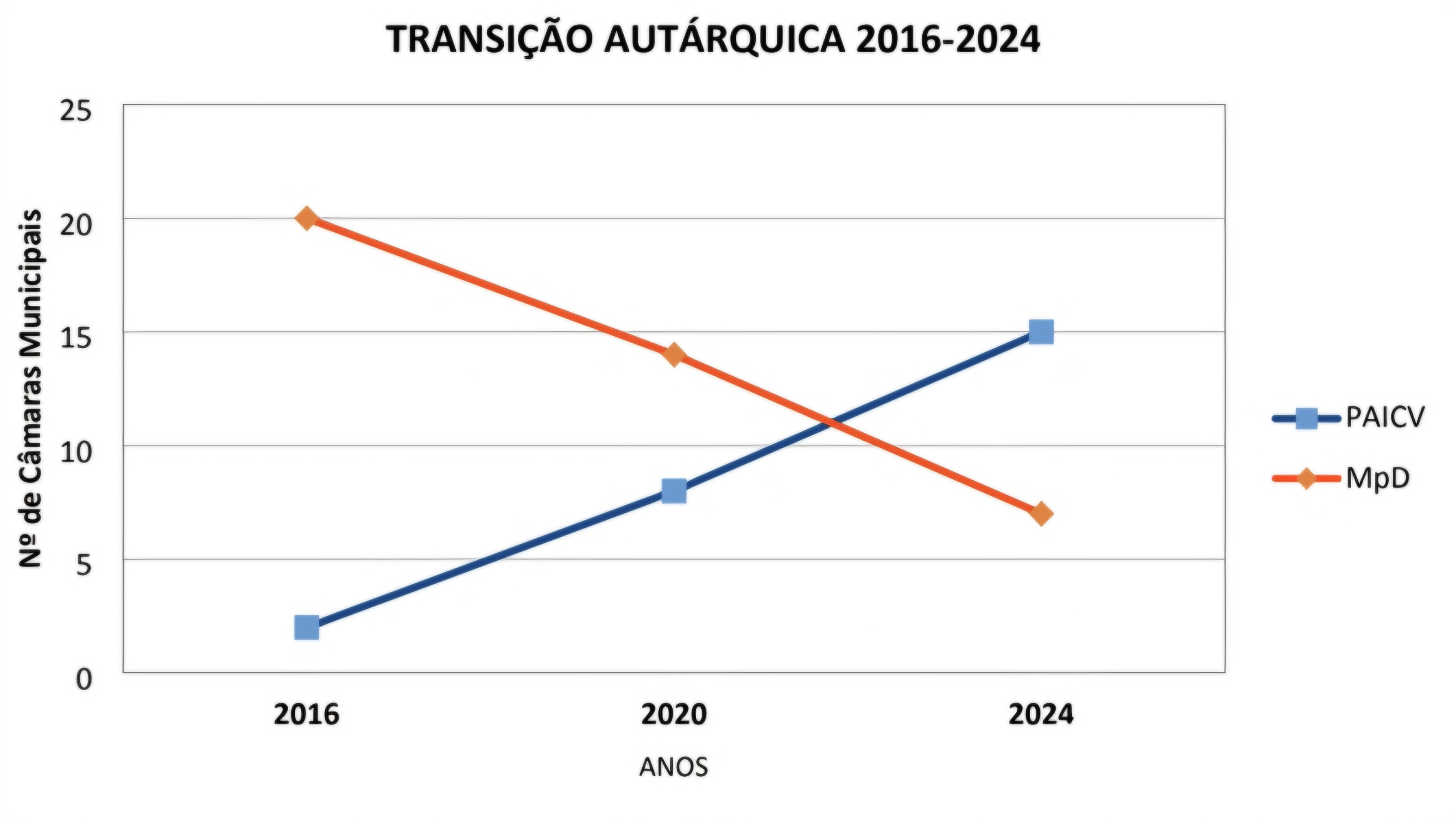 1. De 2016 a 2024, o MpD foi destronado pelo PAICV como o maior partido autárquico desde a institucionalização da democracia em 1991: os ventoinhas tinham vencido as eleições municipais em 20 das 22 Câmaras Municipais do país, em 2016, para conhecerem a sua maior amargura eleitoral autárquica de sempre, em 2024, com a perda de 15 CM para o PAICV e remanescendo em apenas sete;