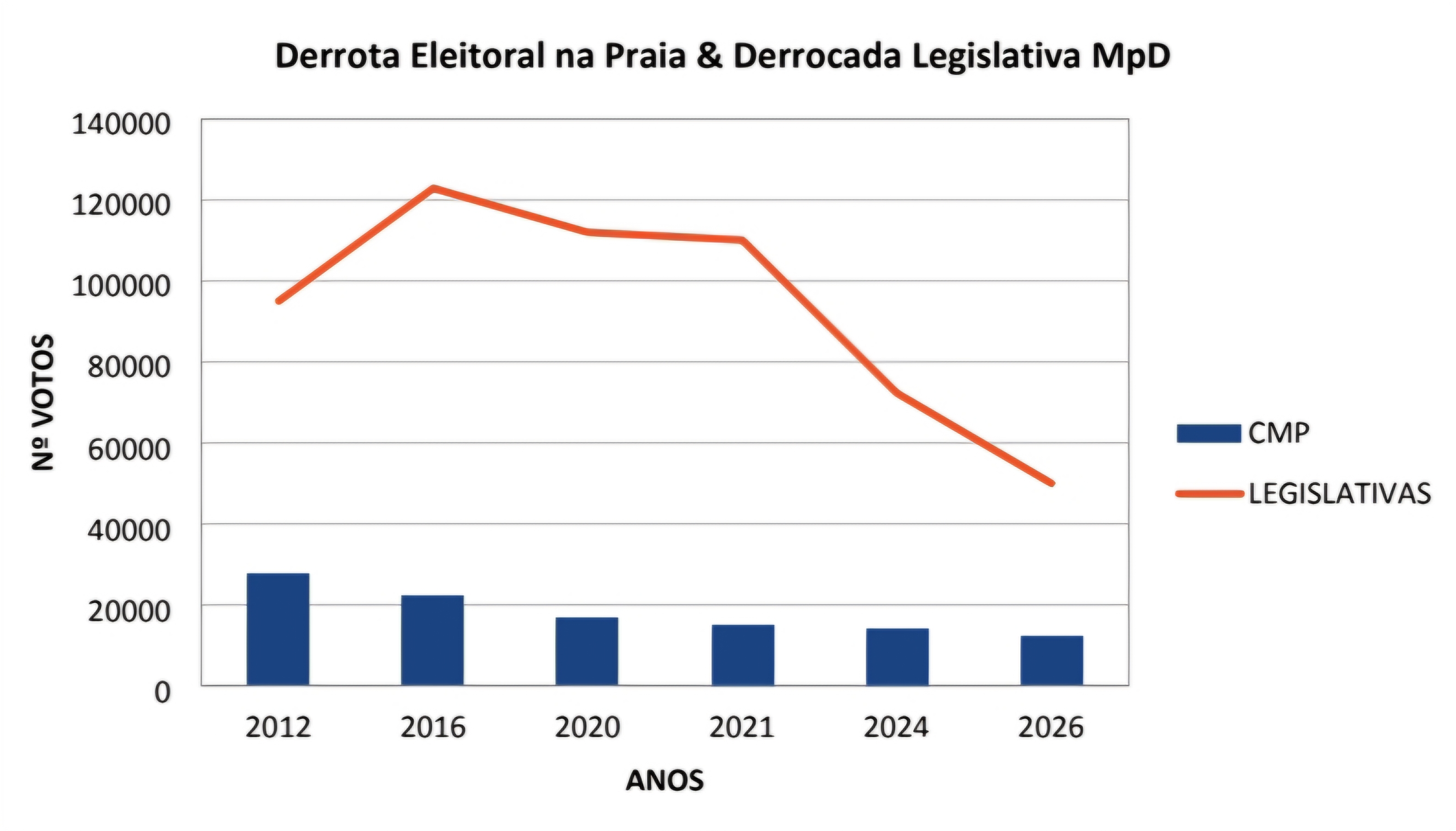 4. De 2012 a 2024 o MpD despenca de 27.483 votos para 14.140, na Praia, e ao nível nacional, perde 50.569 votos em oito anos, de 2016 a 2024;