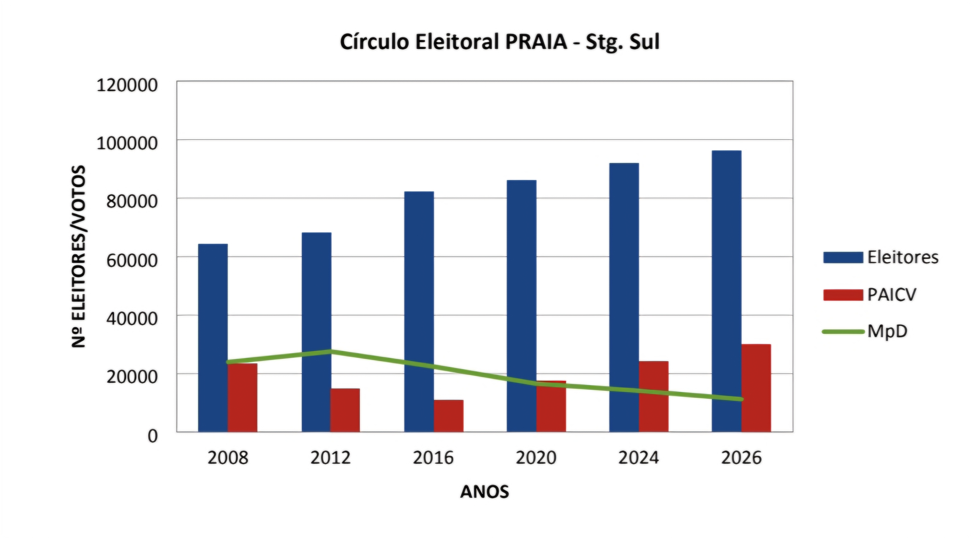 O MpD perde quase 20.000 votos só no Município da Praia de 2012 para 2026, segundo as projeções, enquanto o eleitorado cresceu de 62.000 para quase 100.000 eleitores no mesmo período.