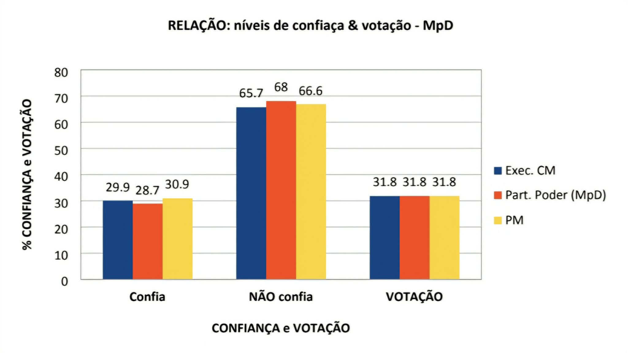 A maioria dos inquiridos (68%) afirma que não confia nada ou muito pouco no partido no poder, MpD, um volume expressivo (66,6%) diz que não confia nada ou muito pouco no Primeiro Ministro, Ulisses Correia e Silva e ainda um percentual considerável (65,7%) aponta que não confia nada ou muito pouco no executivo camarário. Atendendo que o levantamento foi feito em agosto de 2024, nessa data o MpD governava 64% das Câmaras Municipais (14/22).