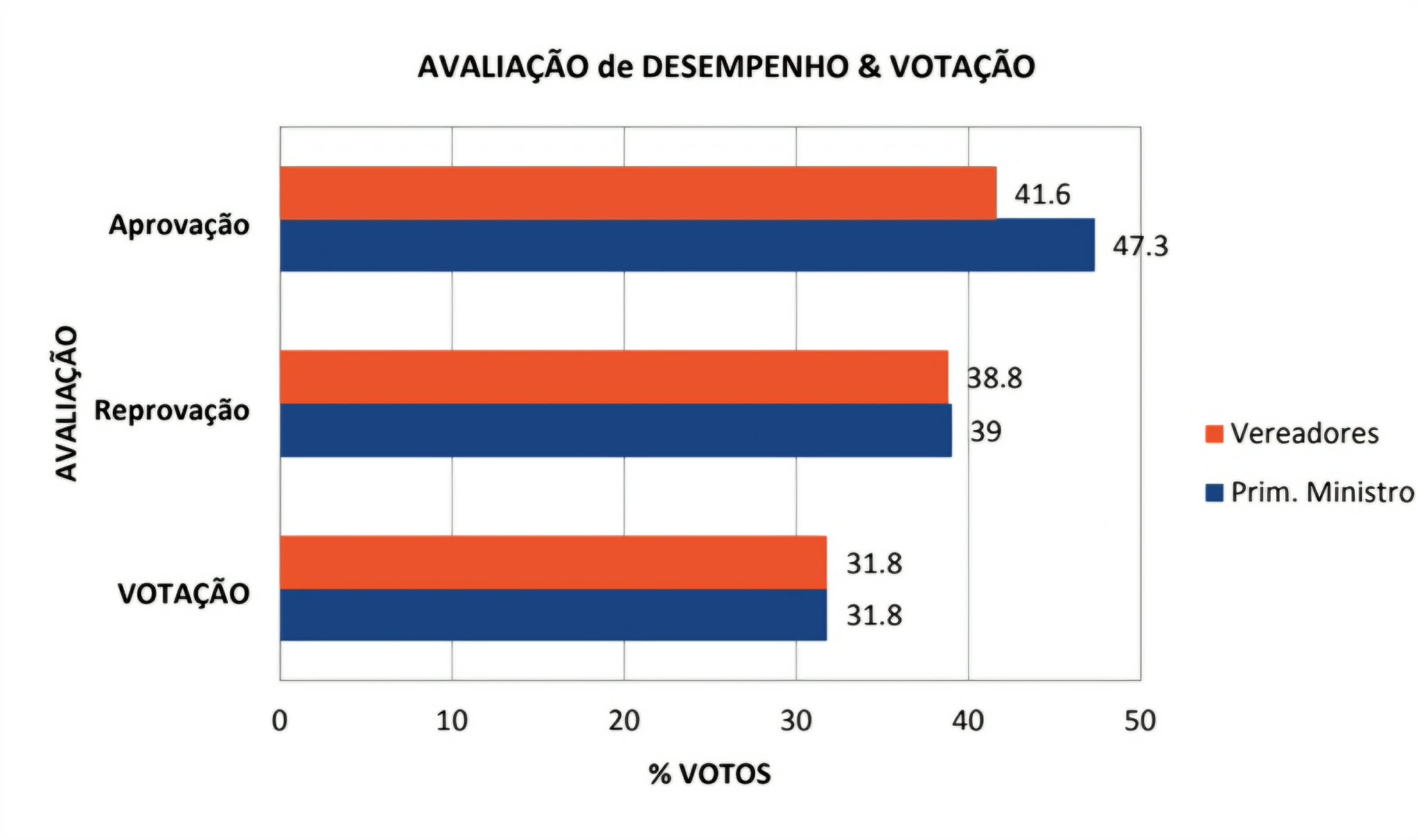 A taxa de reprovação do PM (39%) é até superior à reprovação dos vereadores (38,8%). A aprovação do PM (47,3%) supera a dos Vereadores (41,6%), porém, ressalta-se que nos dois casos tanto da aprovação quanto da reprovação os números pontuais são equiparados por estarem dentro da margem de erro do estudo que é de +/-3%.