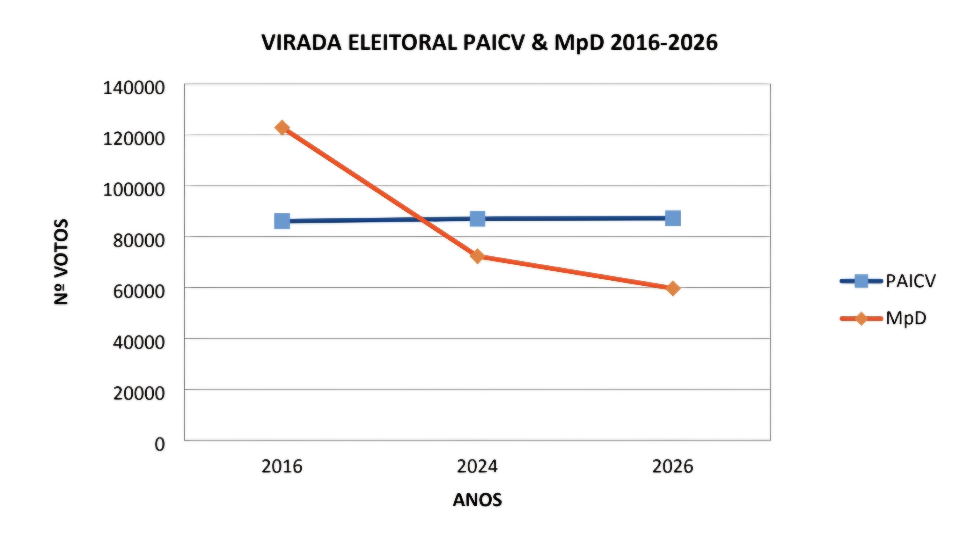 2. O saldo eleitoral dos dez anos de mandato do MpD mostra que em 2016 tivera 122.881 votos nas legislativas enquanto que em 2024 quedara-se para 72.312, ou seja, menos 50.569 em apenas oito anos em trajetória descendente! O MpD perdeu, em média, mais de 6.321 votos por ano (17 votos por dia – quase um voto por hora!!!), no período de 2016 para 2024 e se continuar nesse mesmo ritmo chegará em maio de 2026 com menos de 60.000 votos!