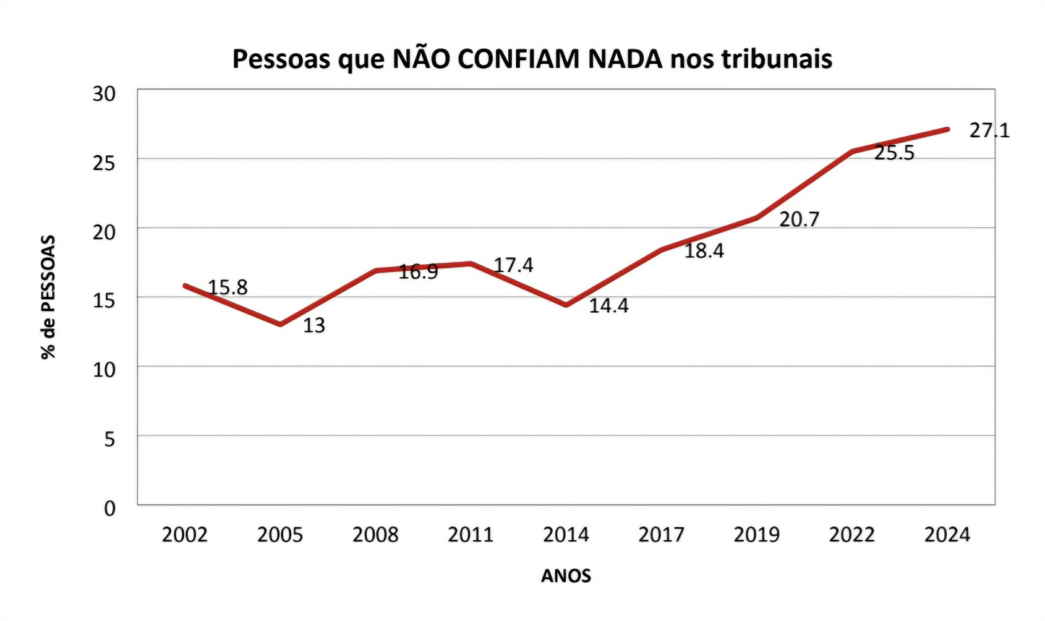 9. Da mesma forma que os eleitores podem formular as suas escolhas políticas nas alternativas que ofereçam para eles melhores condições de emprego, segurança, saúde e, se acreditarem na proposta ofertada podem votar nessa lista ou candidato, igualmente, o eleitor pode votar no candidato ou lista com a qual se identifica com as suas crenças como é o caso das pessoas que não confiam nada na justiça que já alcançaram 27%, em 2024, e, com tendência de crescimento!