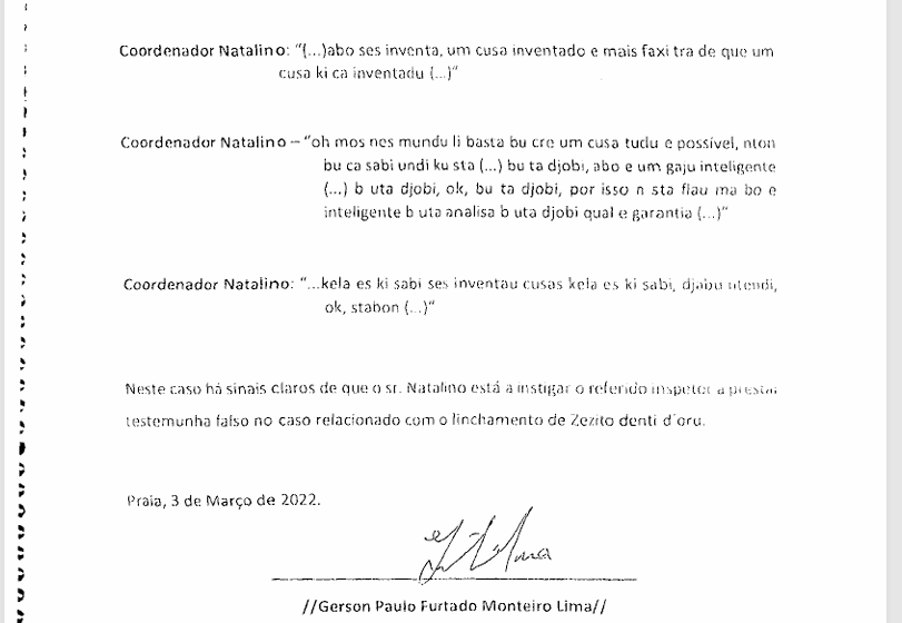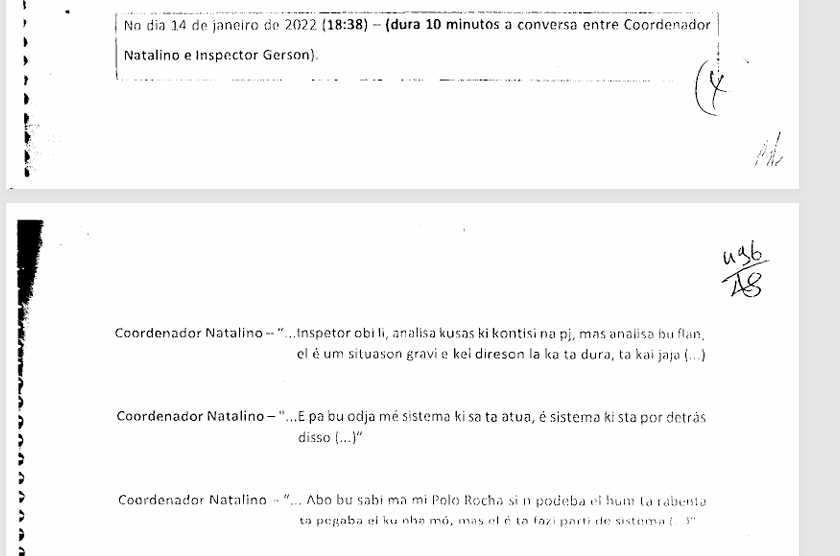 O problema é que dois meses depois de ter sido interrogado por Nilton Moniz e de ter desmentido as próprias declarações feitas a Ary Varela, o próprio Gerson Lima, no dia 3 de Março de 2022, solicitou a junção aos autos de uma suposta conversa mantida por telefone alegadamente com o inspector Natalino Correia, onze dias antes do seu recuo, e onde percebe-se que estariam a combinar quais declarações deveria prestar ao Ministério Público, ao que tudo indica, em troca do arquivamento de um processo crime em que ele, Lima, é arguido por envolvimento com o narcotráfico, e ainda de um processo disciplinar que lhe fora movido em Julho de 2021.