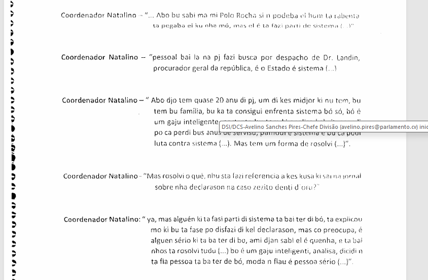 Coordenador Natalino - " Abo dja bu tem quase 20 anu di PJ, um di kes midjor ki nu ten, bu tem bu família, bu ka ta consigui enfrenta sistema bó só, bó é um gaju inteligente, portanto bu tem ki analisa kel situason li po ka perdi bus anus de servisu, pamodi é sistema e bu ka podi luta kontra sistema (...). Mas ten um forma di risolvi (...)".