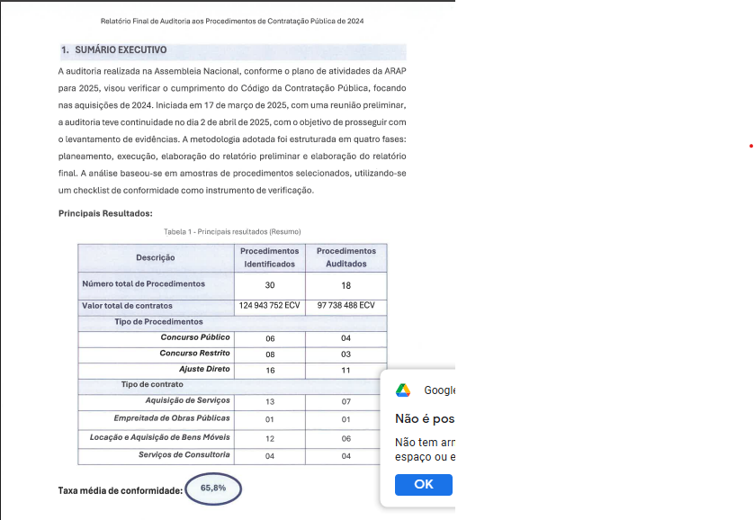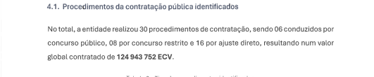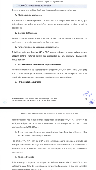 Por outro lado, embora o relatório da ARAP não faz referência a esta qquestão, pesquisas feitas por este jornal dão conta que o Código de Contratação Pública em vigor, estabelece que os contratos dessa natureza, cujos valores ultrapassam os 2.000.000 escudos ficam sujeitos ao concurso, podendo ser firmados por ajuste direto.