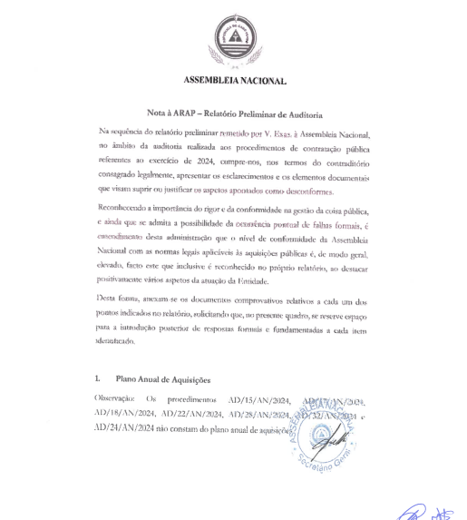 O documento – “Relatório final de Auditoria aos procedimentos de Contratação Pública de 2024” – assinala que em causa está um contrato por ajuste directo, rubricado 2024, a partir do qual a Assembleia Nacional solicita ao jurista Casimiro de Pina a prestação de “serviço de Consultoria para a Revisão da Constituição da República de Cabo Verde e para a Revisão do Código Eleitoral”, pelo valor de 3.043.478 escudos, mas que não consta do Plano Anual de Aquisições do Parlamento.