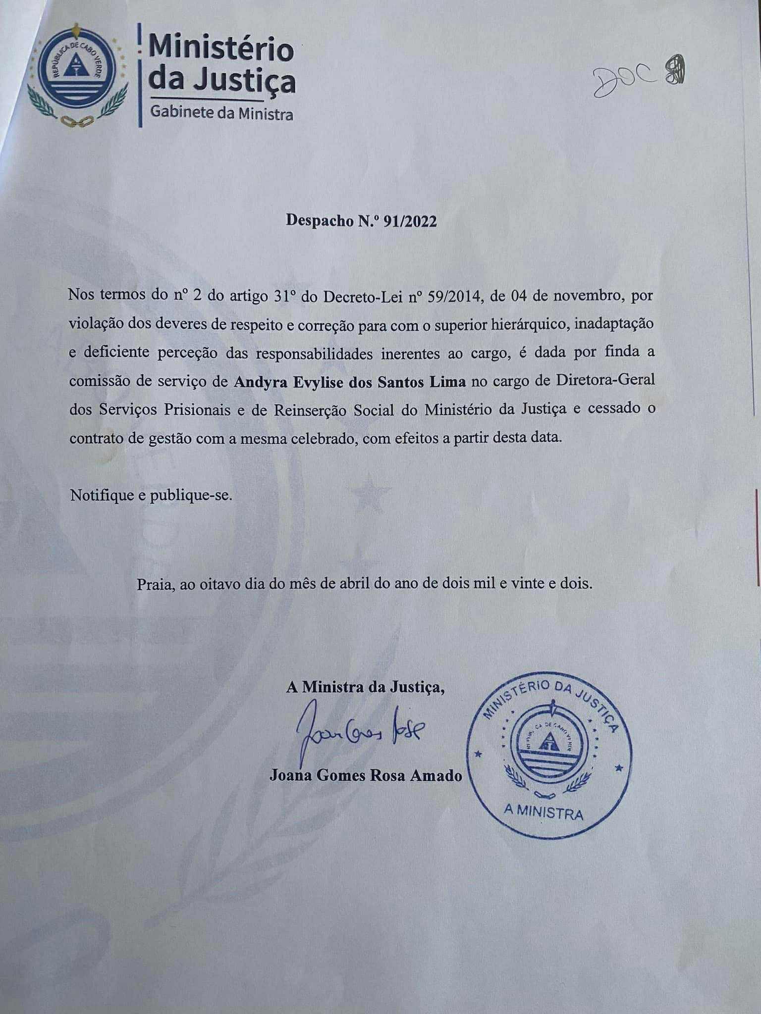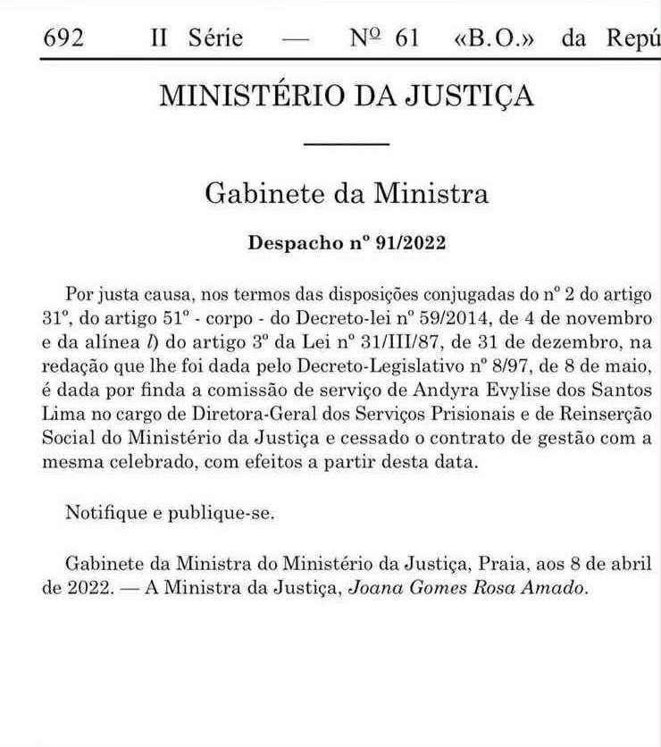 Os factos remontam a abril de 2022 quando, recentemente nomeada, Andyra Lima nem chegou a aquecer o lugar de diretora-geral dos Serviços Prisionais e de Reinserção Social. Surpreendentemente, a ministra da Justiça, Joana Rosa, resolveu demitir quem, pouco tempo atrás, havia nomeado.
