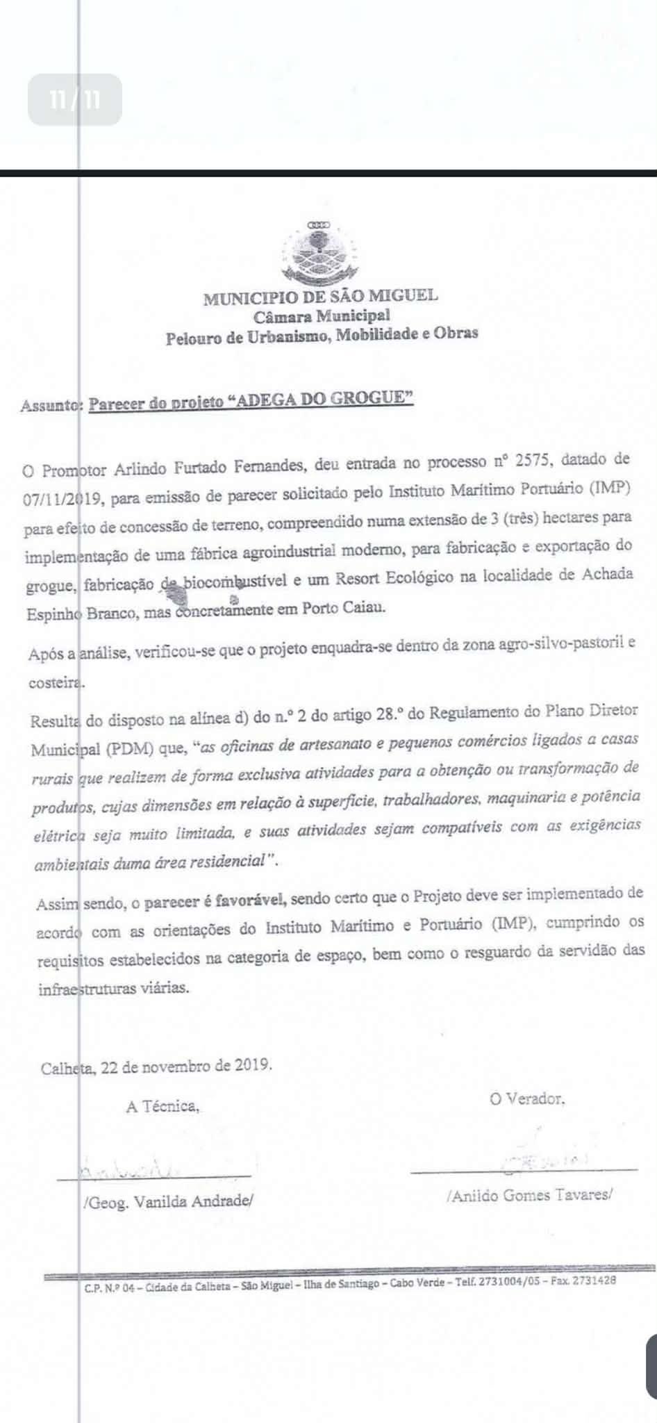 É do conhecimento público que existe um processo em curso para o contrato de Concessão com o Estado de Cabo Verde através do Ministério do Mar (IMP), em que esta mesma Câmara Municipal tinha dado um parecer positivo, agora interfere negativamente para bloquear esta iniciativa.